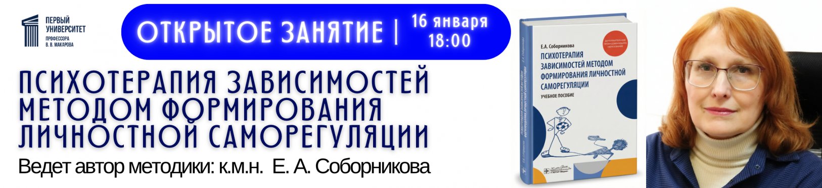 16 января кандидат медицинских наук, автор метода формирования личностной саморегуляции, Е.А. Соборникова проведет открытое занятие, посвященное этой значимой и актуальной теме. Вы узнаете о причинах срывов, секретах мотивации к трезвости и технологиях, которые реально помогают вернуться к полноценной жизни